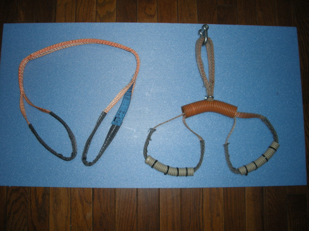• ベルト・スリングは、建設現場、土木などで広く使用されるため、比較的廉価であり、入手しやすいです。なお、目的が玉掛けではないので、JIS規格外ですが、使い勝手が良い、幅20 mmの輸入品を使用しています。