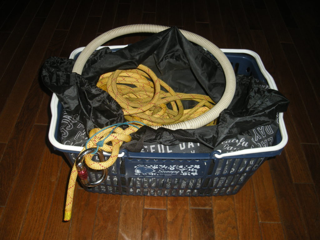 既に久しくなりますが、ボルダリングの方々が、ロープを束ねずに、リュック、あるいは袋に、たぐり寄せたロープを“たぐり寄せた順にそのまま収納する”方式を提案されていました。そこで、弊社でも、ホームセンターで少し丈夫な籠を買い求め、この方式を採用したところ、結果、それ以降、これまで一度もロープが絡むことがなくなりました。