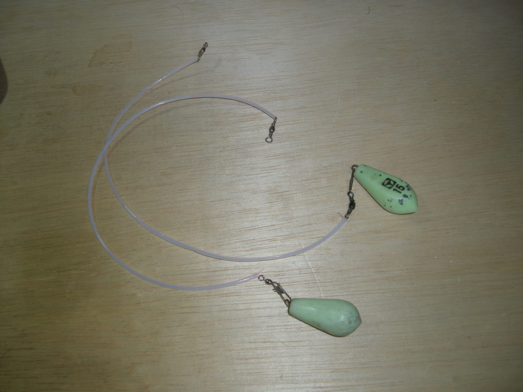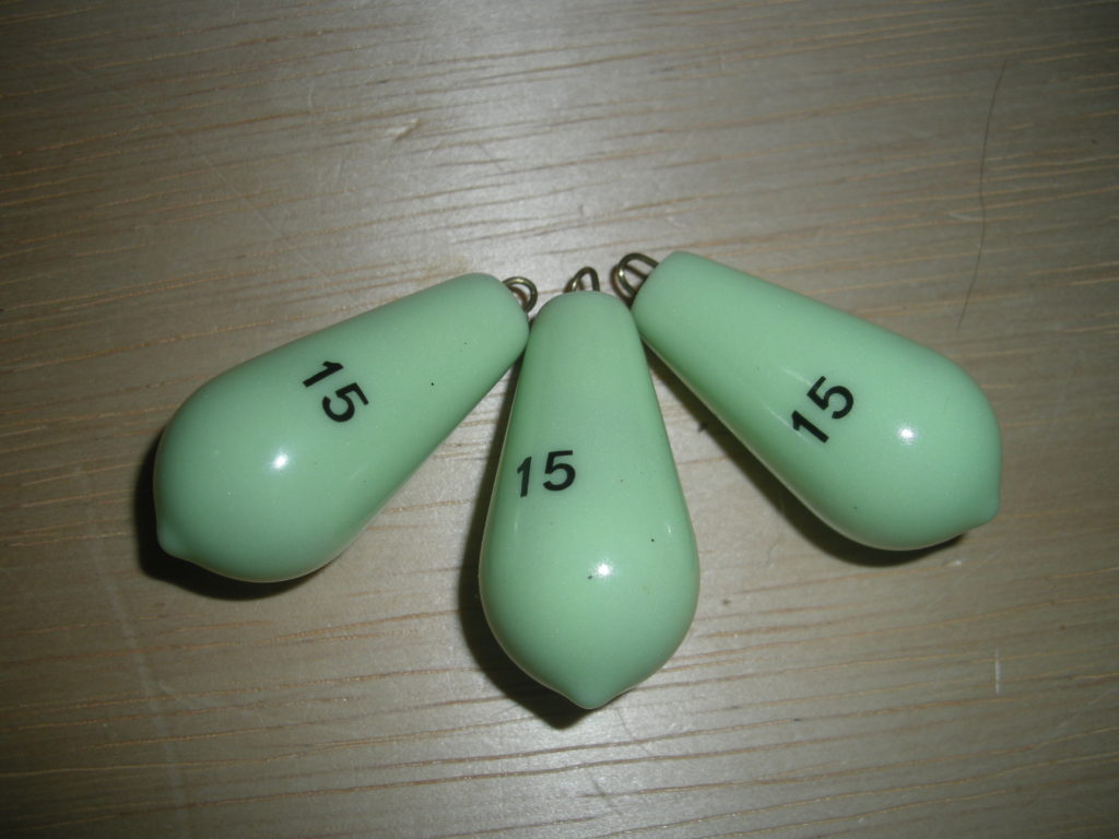 (2) 錘は、釣り用の重さが 15 号(3.75 g x15)、針金製のアイがついた、蛍光色コーティングが施された、なす型の鉛錘を使用します。